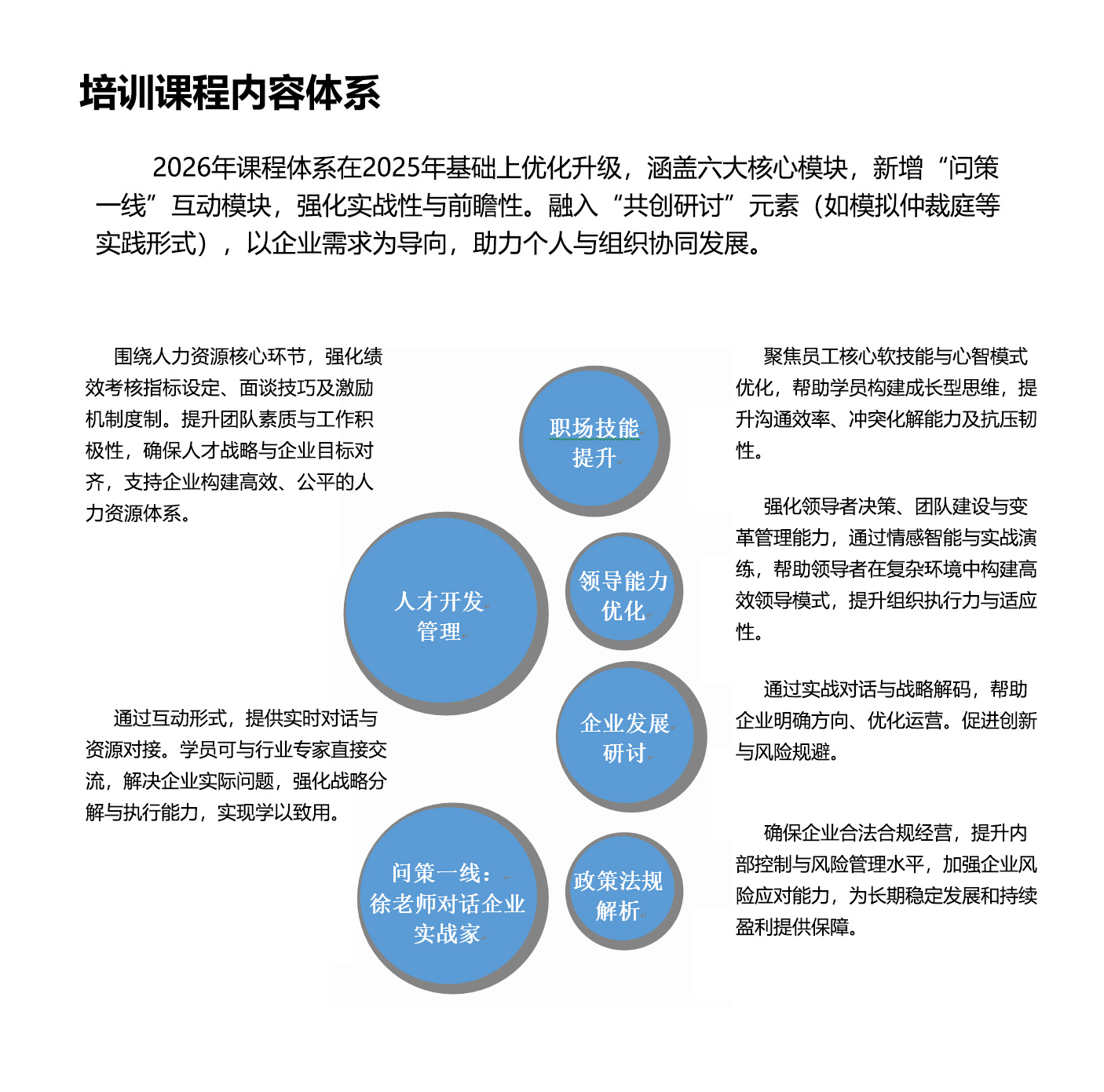 聚焦心智模式优化,培养抗压能力和成长思维,结合心理学工具,激发内在动力,适应快速变化环境。 |